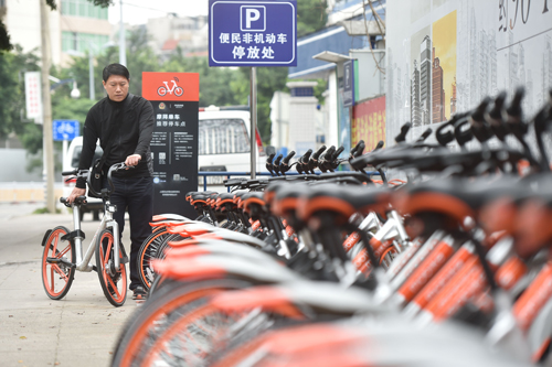4月12日,在福州市上渡派出所前的共享单车停车点,市民在取用单车 宋为伟摄