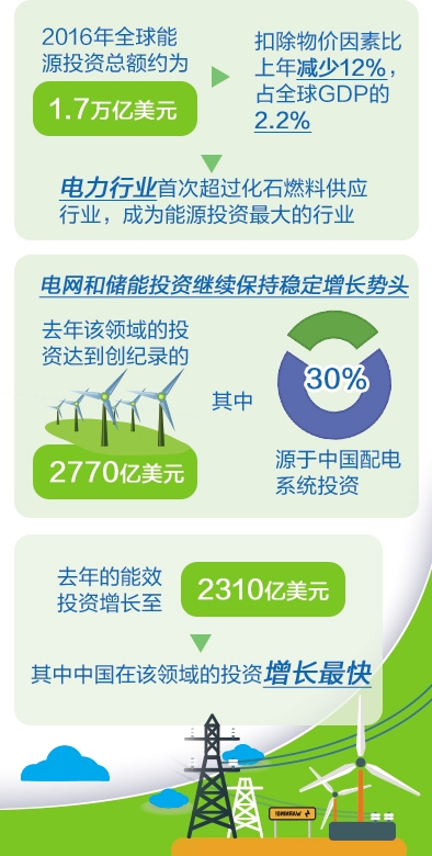 经济日报讯 记者徐惠喜报道:国际能源机构(IEA)日前发布的《世界能源投资报告》显示,2016年全球能源投资总额约为1.7万亿美元,扣除物价因素比上年减少12%,占全球GDP的2.2%。电力行业首次超过化石燃料供应行业,成为能源投资最大的行业。