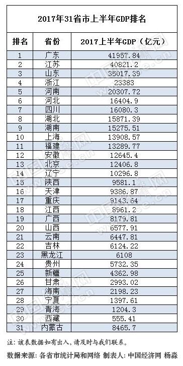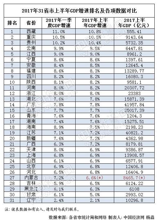 中国经济网北京8月1日讯(记者 杨淼) 随着全国上半年GDP出炉,全国各省市区陆续发布了2017年上半年GDP的“成绩单”。中国经济网根据各省市统计局公布数据统计,目前30个省市已经公开了2017年上半年本省的GDP数据,目前仅有内蒙古官方还未披露相关数据。但据其他媒体统计,内蒙古上半年GDP增速为6.6%。