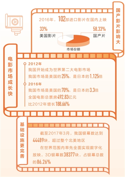 据统计,中国电影创作生产领域的投资主体已接近2000家,有持续创投能力的创投主体超过500家,有力改变了新世纪初期以国有电影企业为基本主体的单一模式。2012年到2016年,平均每年生产电影故事片700部,2016年达到772部,故事影片产量稳居世界三甲之列。