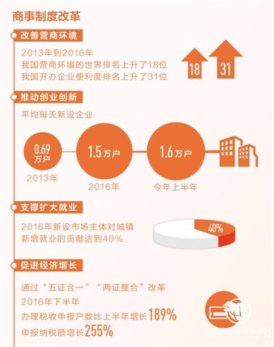 商事制度改革改善了营商环境。从2013年到2016年,我国营商环境的世界排名每年提高6位,这几年共提高了18位,其中开办企业便利度排名较2013年大幅上升31位。
