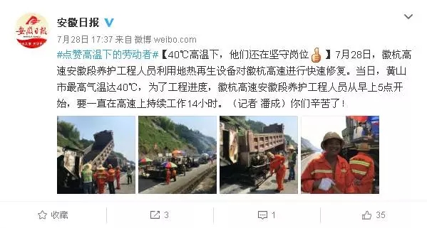 安徽日报法人微博、微信公众号发挥新媒体快速的优势,及时发布气象资讯,提醒有关方面做好高温天气防范应对,叮嘱市民防暑降温。在微博开辟《情义江淮》《点赞高温下的劳动者》等专栏,组织记者深入一线采访,相继推出《安徽哪里最热?“火炉”在皖南,合肥地表温度71℃全国最烫》《民警烈日托举被赞最帅“千斤顶”》《“动车医院”似“桑拿房”,昼夜不停歇运转》等稿件,用文字、视频、图片等,展现高温下劳动者坚守岗位的身影,为他们点赞鼓劲。稿件从标题到内容都生动活泼,信息量大,可读耐读,适应了网民阅读需求。