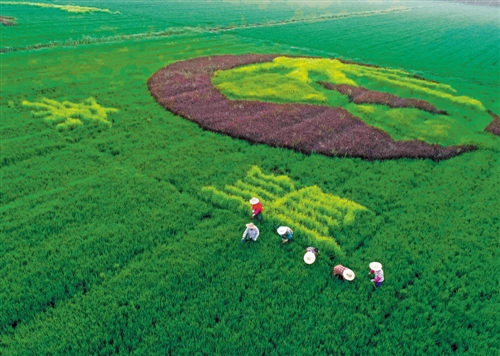 8月6日,江苏泰州市秋雪湖生态景区南舍村的多彩稻田画。近日,泰州市秋雪湖多彩稻田画迎来了最佳观赏期。该景区曾被推介为十大稻田景观之一,吸引各地游客前来观光。 汤德宏摄