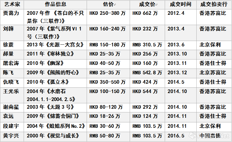 而且香港拍场诞生“曝光效应”也能很好地延续到内地市场中,使挖到“第一桶金”的艺术家们的市场价格快速成长,在接下去的每个拍卖季中均有明显增幅,并伴随着大量高价拍品的诞生,快速步入一个市场小周期中的“过热期”。