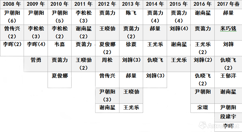 一个有趣的现象是,在市场整体表现越好的年份,青年艺术成交单价TOP10的名单人数越少,在市场起伏时,反倒能看到许多新鲜面孔涌现。如2008年TOP10名单由尹朝阳、曾传兴和李晖3位艺术家占据,2015年则是贾蔼力、刘韡、谢南星和王光乐,而2016年则有7位艺术家进榜。显然,在市场过热时,资本的投注区域也变得更加集中。