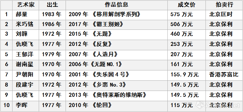 由于2017年的秋拍还尚未开始,并不能武断地判断今年青年艺术市场的景气程度。不过从高价作品的分布来看,北京保利是本季对青年艺术家作品推荐力度最大的拍卖行,不仅开设了“尤伦斯男爵珍藏中国当代艺术”专场,拍出多件尤伦斯的中国青年艺术家藏品,还在日、夜场中持续推出“新绘画”作品。