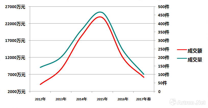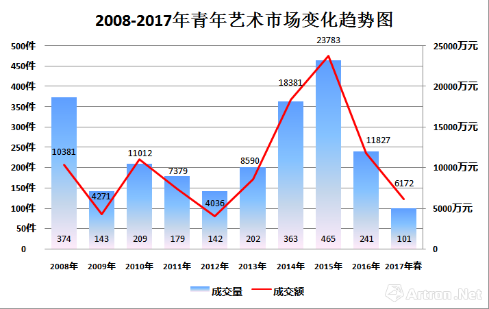 图表1-2008-2017年青年艺术家(1970年以后出生)的年度成交额及成交量变化走势图