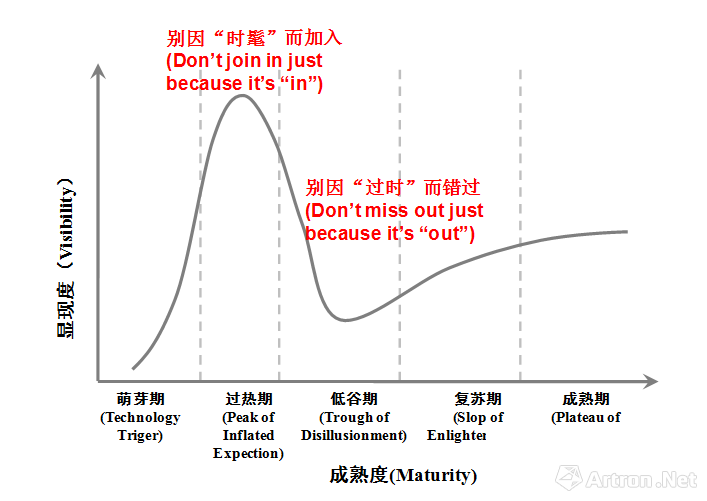 在上世纪美国硅谷崛起的时候,许多尚处于萌芽期的新概念刚一出现就被寄予厚望。媒体和学术界的热捧,有时甚至是非理性的渲染,引得一些企业跃跃欲试,公众对新技术的预期也陡然飙升而进入过热期。而后随着诸多尚未认识到的问题和风险逐渐显露出来,尤其是一些急功近利的盲目扩张造成的灾难性后果,更使对技术的关注度跌入谷底期。于是,面对严峻的现实,人们开始反思,并且从实际出发重新认识和评估新技术的价值,对技术的关注度得以逐步进入攀升期。在此过程中经营模式得到创新、适用的工具和方法论应运而生,并在数代演进之中趋于成熟,于是新技术应用进入成熟期。
