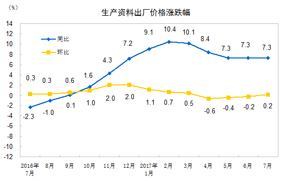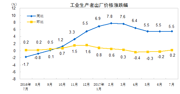 2017年7月份,全国工业生产者出厂价格同比上涨5.5%,环比上涨0.2%。工业生产者购进价格同比上涨7.0%,环比持平(涨跌幅度为0,下同)。1-7月平均,工业生产者出厂价格同比上涨6.4%,工业生产者购进价格同比上涨8.5%。