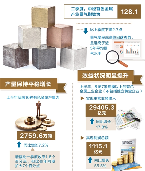 产量保持平稳增长。最新数据显示,上半年我国10种有色金属产量为2759.6万吨,同比增长7.2%,增幅比一季度收窄1.8个百分点,但比去年同期扩大7个百分点;效益状况明显提升。上半年,8167家规模以上有色金属工业企业(不包括独立黄金企业)实现主营业务收入29405.3亿元,同比增长17.8%;实现利润总额1115.1亿元,同比增长55.5%。