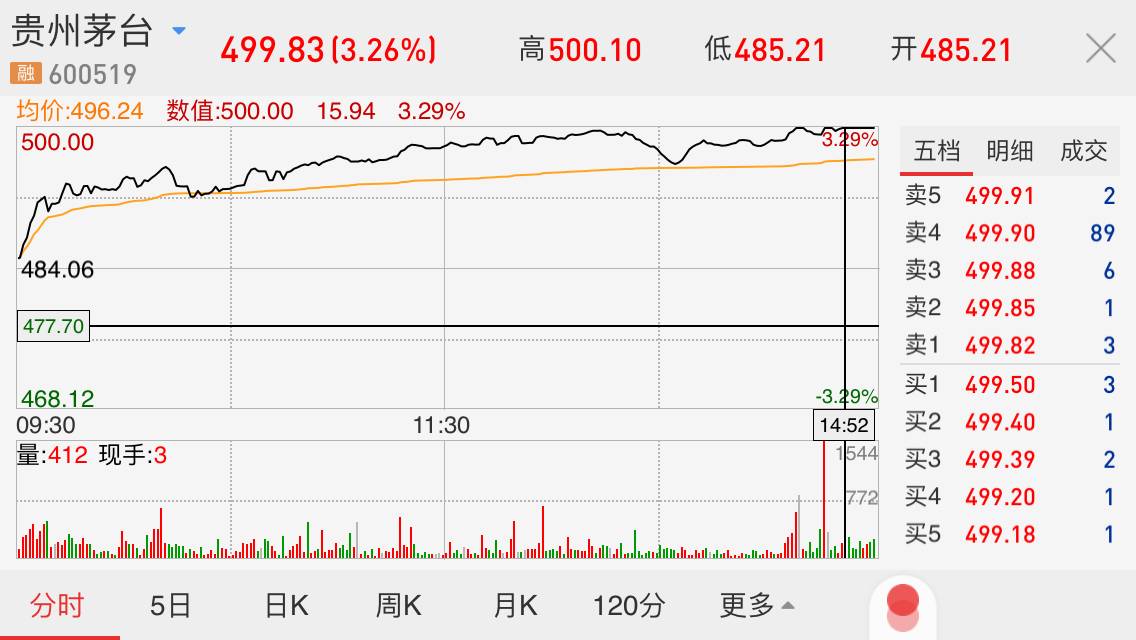 贵州茅台早盘高开后,一路走高,午后持续发力,接近尾盘,达到了500.10元/股。收盘时,小幅回落,报收499.83元/股,全天大涨3.26%