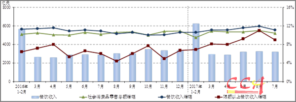 经济日报-中国经济网北京8月15日讯 据国家统计局昨日发布数据显示,2017年7月,全国餐饮收入3204亿元,同比增长11.1%;限额以上单位餐饮收入809亿元,同比增长9.0%。2017年1-7月,全国餐饮收入21750亿元,同比增长11.2%;限额以上单位餐饮收入5342亿元,同比增长8.5%。
