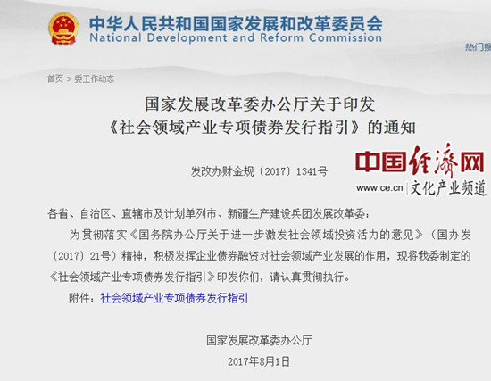 国家发改委网站消息,日前,国家发改委印发《社会领域产业专项债券发行指引》提出,支持企业发行文化产业专项债券等社会领域产业专项债券。