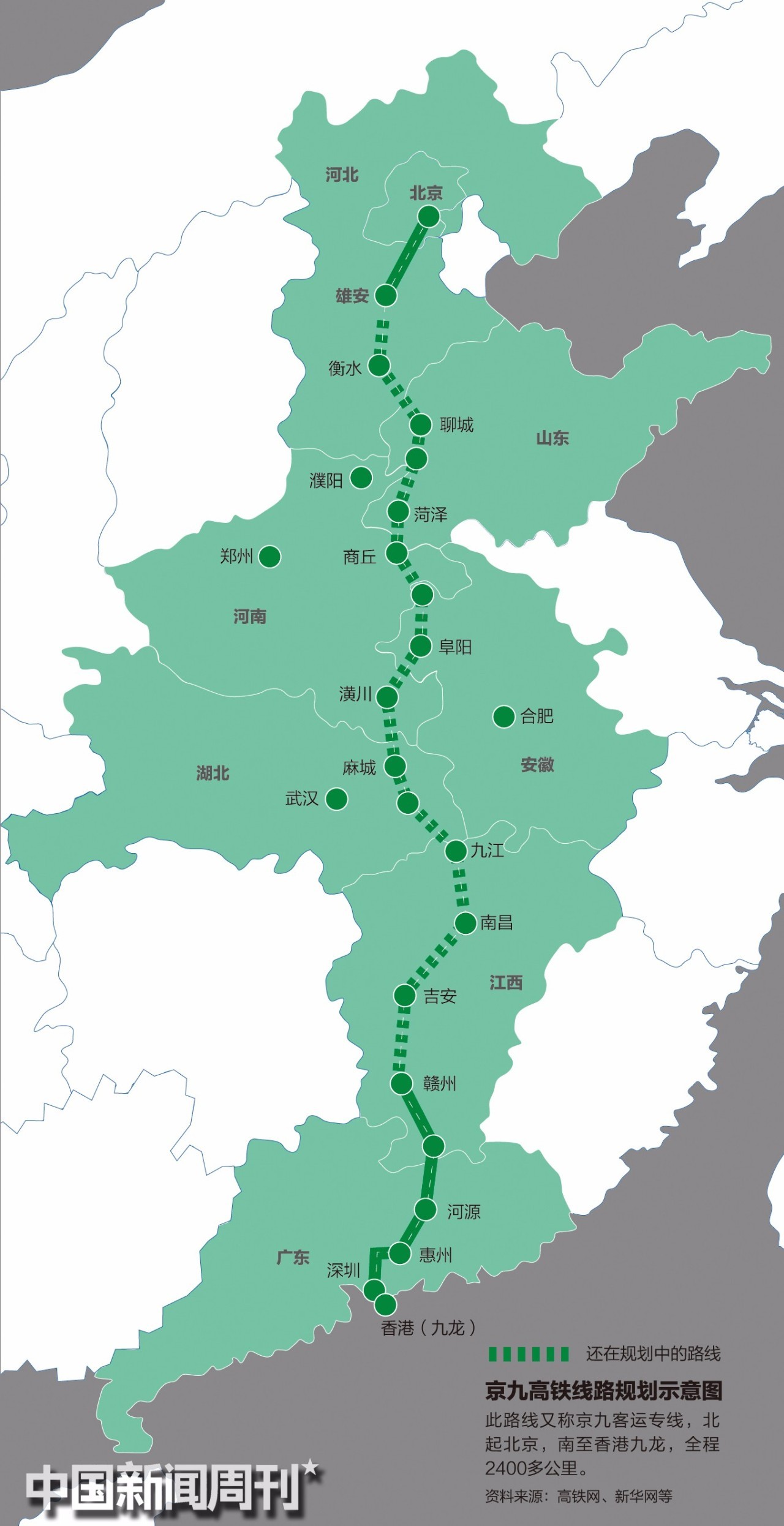 京九高铁,又称京九客运专线,北起于北京,南至香港九龙,全程2400多公里。线路建设采用各地分段建设最后连成一线的方式。其中到达衡水之前的分段,就是目前已开始环评的京雄铁路,由北京新机场站出京后,途经廊坊,进入雄安新区。