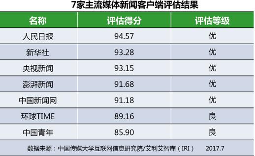 7家主流媒体新闻客户端信息生态指数总分平均值为91.27。人民日报、新华社、央视新闻位列前三。7家主流媒体新闻客户端总分情况如下: