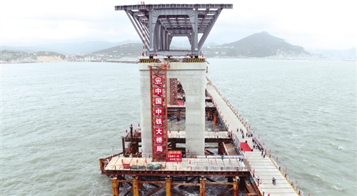 平潭海峡公铁两用大桥首孔简支钢桁梁架设成功。 (新华社发)