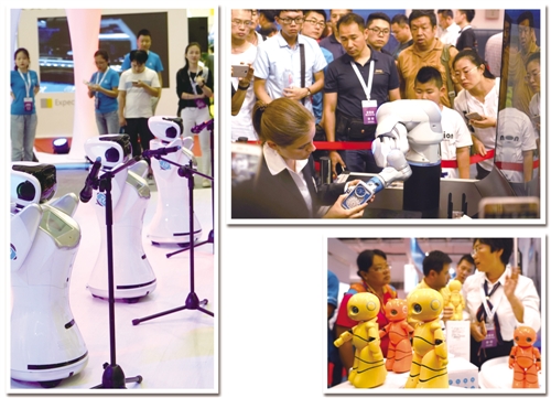 2017世界机器人大会上,多种机器人亮相,带给人们新、奇、特的感知体验。左图为会唱歌的机器人在表演节目。上图为工作人员演示一款仿生技术机械臂。右图为一款服务型机器人。本报记者 赵 晶摄