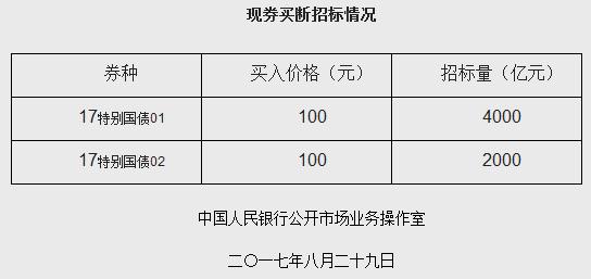 8月29日讯 央行今日发布公开市场业务交易公告 [2017]第166号。央行公布,为维护银行体系流动性基本稳定,2017年8月29日人民银行以数量招标方式进行了公开市场业务现券买断交易,从公开市场业务一级交易商买入6000亿元特别国债。