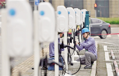 海宁加快建设充电桩,助推绿色出行。图为工作人员检查充电桩。