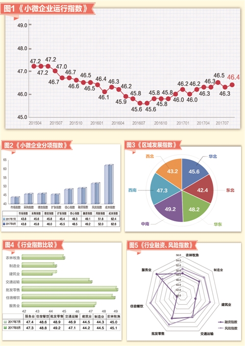 2017年8月份,“经济日报—中国邮政储蓄银行小微企业运行指数”(见图1)为46.4,较上月回升0.1个点,表明8月份小微企业运行略有好转。