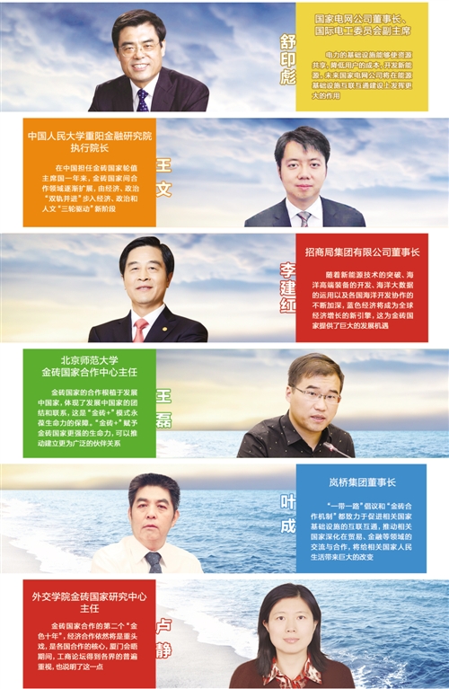 “金砖国家是开放的、共赢的,不是封闭的。期待能有更多国家和地区加入到‘金砖+’朋友圈,也呼吁更多的工商界同仁和民间文化机构加入。工商界需要用更加开放的态度,积极参与到金砖合作中,紧紧抓住‘金砖机遇’,在互联互通、蓝色经济、贸易投资等领域加强合作,创造第二个‘金色十年’。”岚桥集团董事长叶成说。