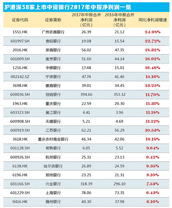 《投资者报》记者通过整理38家上市银行的年报发现,2017年上半年合并净利润(下同)同比增速位居前十的银行中,除招商银行是净利润百亿级别的全国性股份制商业银行外,其余都是城商行和农商行,半年净利润在4亿元到56亿元之间不等。