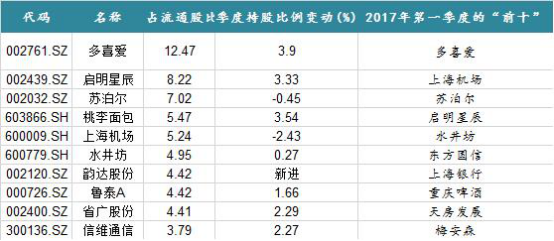 2017年第二季度持股的上市公司家数为19家,比2017年第一季度的14家,增加5家。其中,桃李面包、水井坊、海大集团、汤臣倍健被增持。另外,本季度QFII“前十”持股的持股比例都在3%以上,桃李面包、水井坊赫然在列。