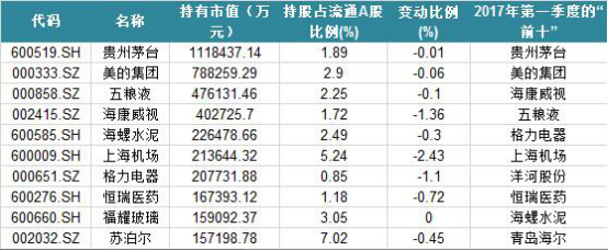 2017年第二季度QFII持有市值前十名的股票,数据来源:wind