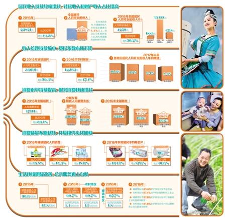 党的十八大以来,在以习近平同志为核心的党中央领导下,各地区各部门坚持以人民为中心的发展思想,认真贯彻落实全面建成小康社会的战略目标和方针政策,通过一系列惠民举措,切实提高城乡居民收入水平,增强人民群众的获得感。5年来,我国城乡居民收入持续较快增长,收入差距不断缩小,消费水平和质量持续提高,生活环境明显改善,为到2020年全面建成小康社会的宏伟目标奠定了坚实基础。
