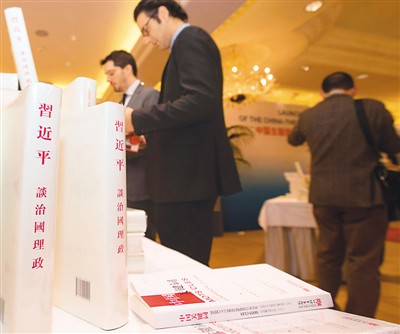 2017年1月,来宾在瑞士日内瓦举行的中国主题图书全球新年展销月启动仪式上浏览《习近平谈治国理政》。新华社记者 徐金泉摄