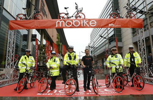 资料图片:2017年6月29日,在英国曼彻斯特,几名警察在摩拜单车投放仪式上合影。新华社发