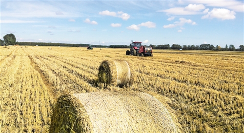 图为黑龙江农垦江川农场水稻秸秆回收现场。农场推广的水稻割晒、拾禾两段式收获技术,为秸秆打包提供了基础。这些打包的秸秆将交给当地的泉林纸业黑龙江分公司,可用于发电、造纸、供热。 (本报记者 乔金亮摄)