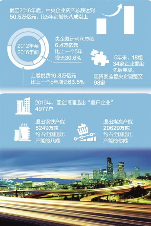 党的十八大以来,国资委先后完成18组34家企业的重组,央企由117家调整至98家。3家电信企业成立铁塔公司,中国航材和三大航空公司成立航材保障共享平台,相关煤炭企业组建央企煤炭资产管理平台,推动资源向优势企业集中、向企业主业集中。央企重组成效显现:通过横向合并,强化了规模效应。今年有48家央企入围世界500强,行业带动力和影响力显著提升;通过纵向联合,实现优势互补,完善产业链上下游协同,企业综合实力显著提升;通过专业化整合,优化资源配置,资源共享水平大大提高。