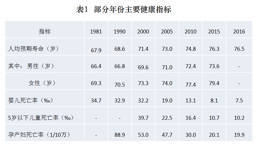 健康事业的发展给人民群众带来实实在在的健康福祉,中国人均预期寿命从1981年的67.9岁提高到2016年的76.5岁,孕产妇死亡率从1990年的88.9/10万下降到2016年的19.9/10万,婴儿死亡率从1981年的34.7‰下降到2016年的7.5‰,居民的主要健康指标总体上优于中高收入国家平均水平,提前实现联合国千年发展目标。同时,中国已形成了以宪法为总领,以民事法律法规、卫生行政法律法规、地方性法规等为实施基础,以健康领域各种纲要、纲领、计划为行动指南的健康制度体系,有效平衡医患关系,公正化解医疗纠纷,切实实现公民健康权。