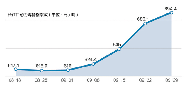 9月初以来,煤炭供应偏紧,市场价格持续上涨,煤价呈现出“淡季不淡”特征。现货价格从9月初的620元/吨左右(5500大卡)一路飙升至730元/吨左右。