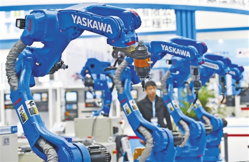 2017年3月9日,中国国际装备制造业博览会在天津开幕。图为博览会上展示的用于电焊、搬运和涂胶的机器人。新华社记者 连漪 摄