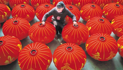 2017年1月11日,在安徽合肥市开明工艺宫灯制造有限公司内,工人在整理红灯笼半成品。新华社记者 郭晨 摄