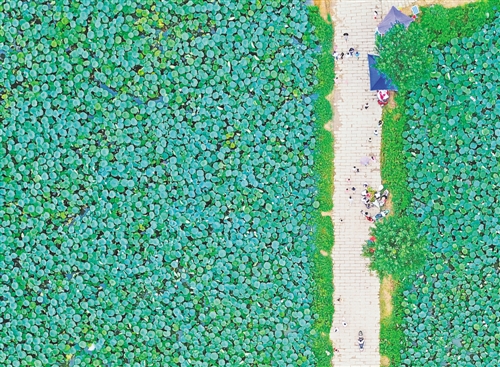 2017年8月8日,游客在河南信阳市平桥区郝堂村游玩、欣赏荷花。新华社记者 李博 摄