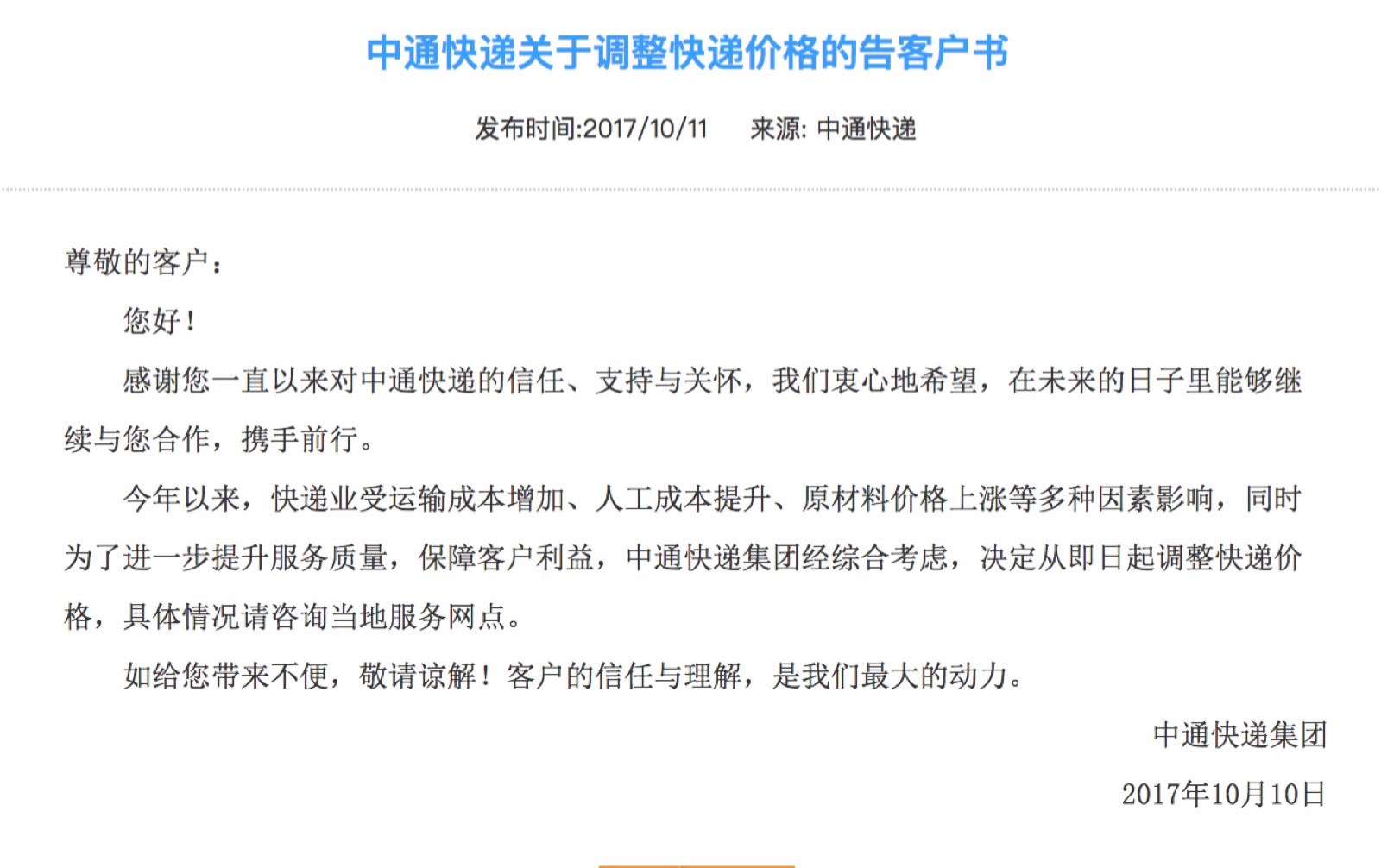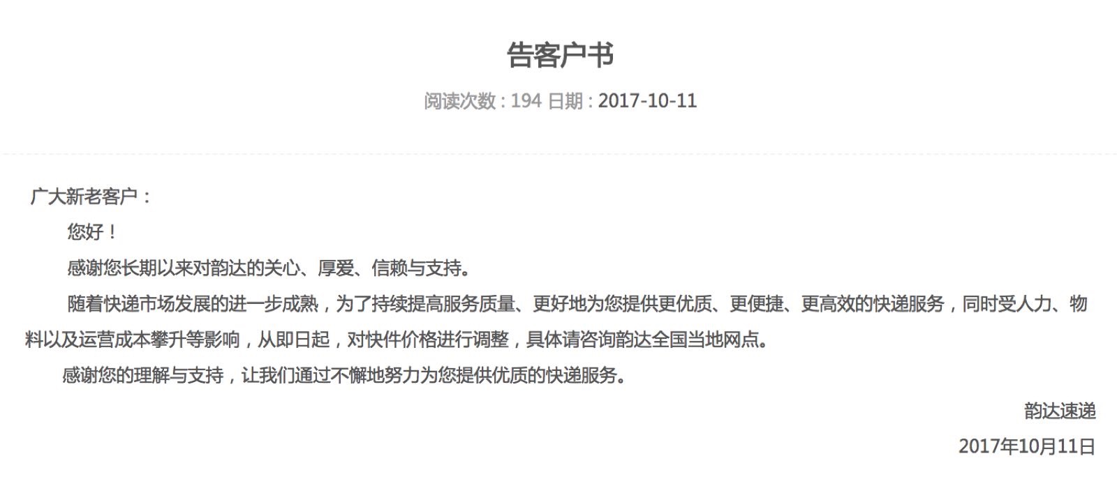 10月10日、11日,中通、韵达先后发布告客户书,表示因运输成本、人工成本和原材料价格上涨等因素,决定从即日起调整快递价格,具体情况请咨询当地服务网点。
