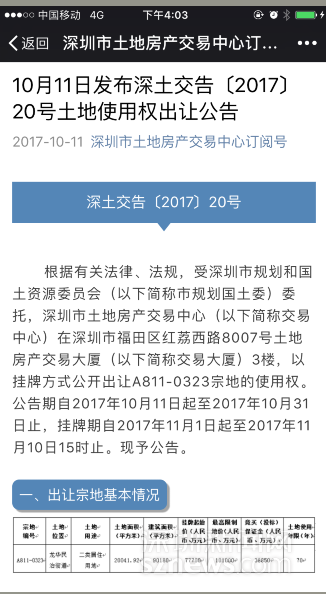 深圳新闻网10月11日讯(记者 张玲)深圳市土地房产交易中心近日发布公告,以挂牌方式公开出让A811-0323宗地的使用权。这是深圳首次采用住房全年期(全年期就是70年)只租不售的办法以挂牌方式出让居住用地。