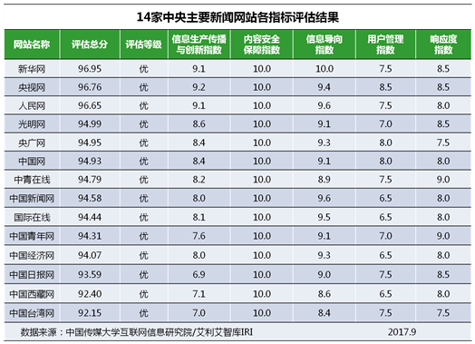 新华网、央视网、人民网排名位于中央主要新闻网站前列,14家中央主要新闻网站评估结果具体情况如下: