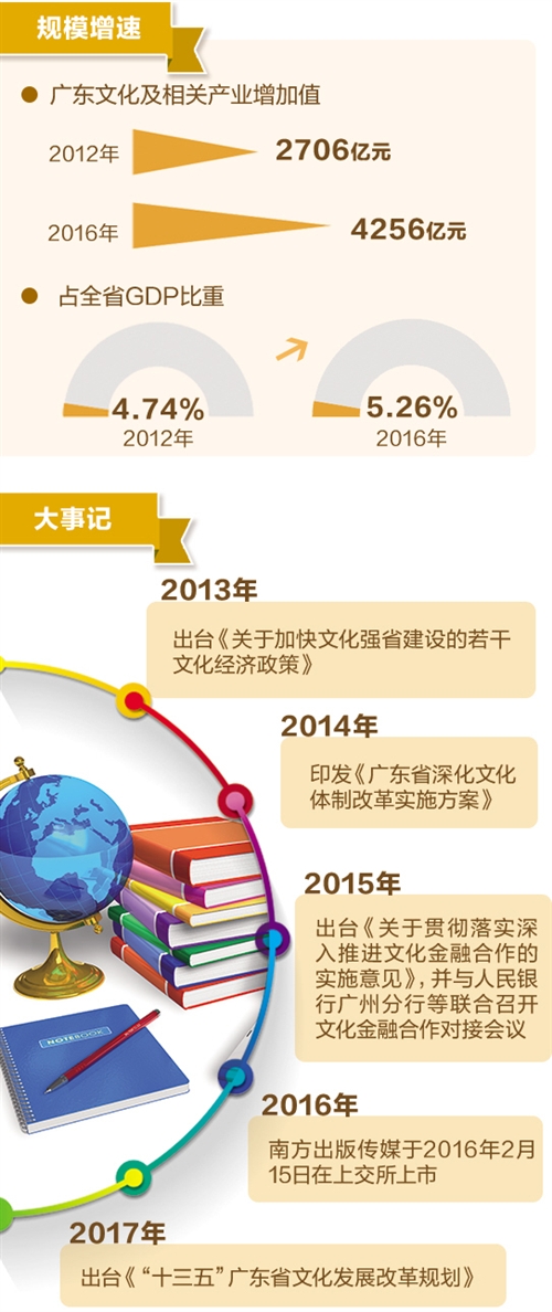 在国庆节前夕,广东文化产业再传捷报。经国家统计局核定,2016年,广东文化及相关产业增加值为4256.63亿元,同比大幅增长16.67%,增速为5年来最高,占全省GDP比重大幅上升到5.26%,约占全国文化产业总量的七分之一,遥居各省区市首位,已成为广东国民经济重要支柱产业。广东文化产业快速发展引起了海外关注。外媒曾以“广东文化产业呈裂变式发展”为题报道称,以工业制造业闻名的广东,如今文化产业发展和文化产品输出步伐也快得惊人。