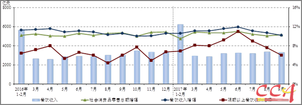 经济日报-中国经济网北京10月20日讯 据中国烹饪协会消息,10月19日国家统计局最新发布数据,2017年9月,全国餐饮收入3317亿元,同比增长10.2%;限额以上单位餐饮收入856亿元,同比增长6.0%。2017年1-9月,全国餐饮收入28427亿元,同比增长11.0%;限额以上单位餐饮收入7034亿元,同比增长8.1%。