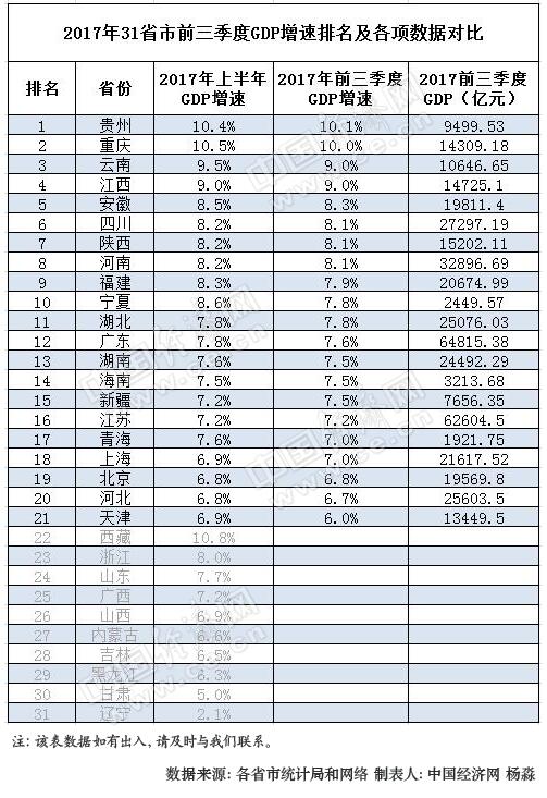 2017年前三季度31省区GDP增速排行榜。(持续更新......)
