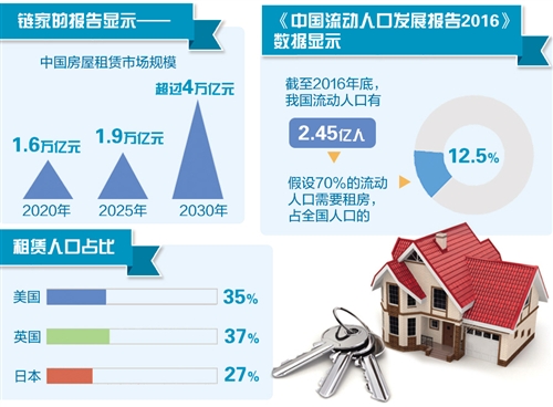 《中国流动人口发展报告2016》数据显示,截至2016年底,我国流动人口有2.45亿人,假设70%的流动人口需要租房,占全国人口的12.5%。美国租赁人口占比为35%,英国租赁人口占比为37%,日本租赁人口占比为27%。租房人口占比低,将保证租赁市场未来的增长空间。