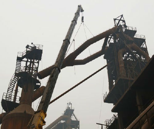 资料图片:钢铁行业是河北化解过剩产能和推进污染治理的重点。图为邯郸市烘熔钢铁公司高炉拆除现场。