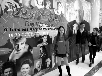 歌剧《女武神》首演当天,年轻观众在展板前拍照。本报记者 韩轩摄