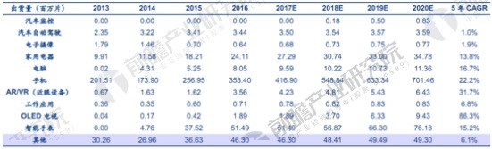 此外,OLED屏的应用市场不仅局限于智能手机,凭借其轻薄、柔性、高对比度、低能耗等特点,OLED还广泛应用于电视面板、智能可穿戴设备、平板电脑、AR/VR、车载面板等领域。根据前瞻产业研究院发布的《OLED产业市场预测分析报告》数据,到 2020年,全球OLED出货量将达到9亿片,是2015年出货量的2.5倍,年复合增长率为20%。OLED终端产品出货量测算
