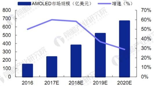 2016年,OLED屏在智能手机中的渗透率达到20%,市场规模为150亿美元。根据市场预期,iPhone X使用OLED屏,考虑到iPhone的行业影响力,OLED屏的应用市场将完全打开,未来需求空间非常广阔。2020年OLED屏在智能手机中的渗透率有望攀升至65%,市场规模达到670亿美元。OLED面板市场规模预测