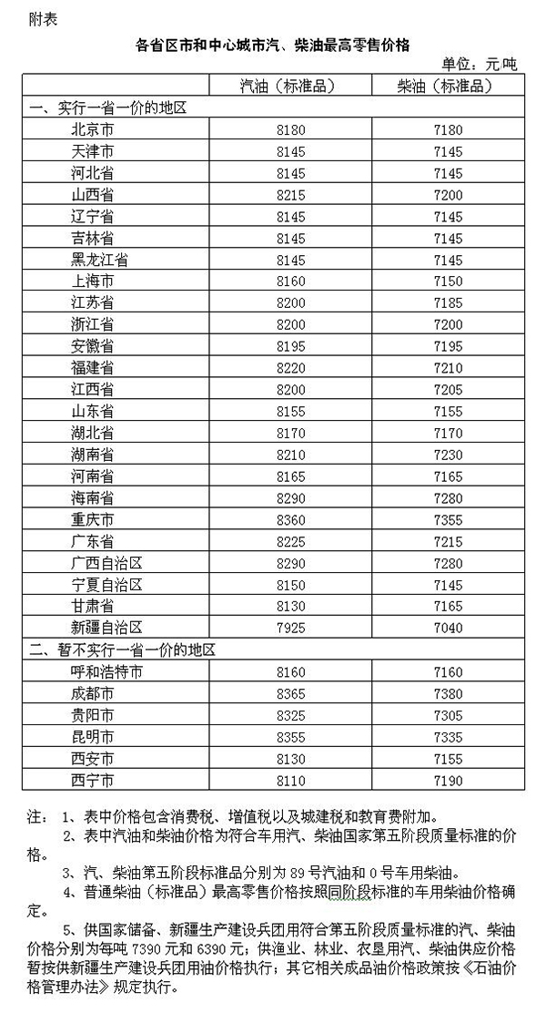 附:各省区市和中心城市汽、柴油最高零售价格